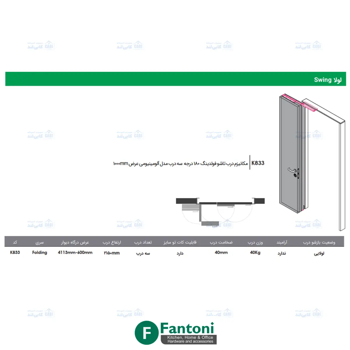 مکانیزم درب تاشو فولدینگ 180 درجه سه درب آلومینیومی عرض 1000mm فانتونی K833 :