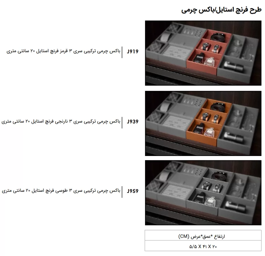 باکس چرمی ترکیبی جای ساعت و کمربند فرنچ استایل فانتونی J919 و J939 و J959 با رنگ قرمز، نارنجی و طوسی، مناسب جای ساعت و کمربند و عطر و ادکلن