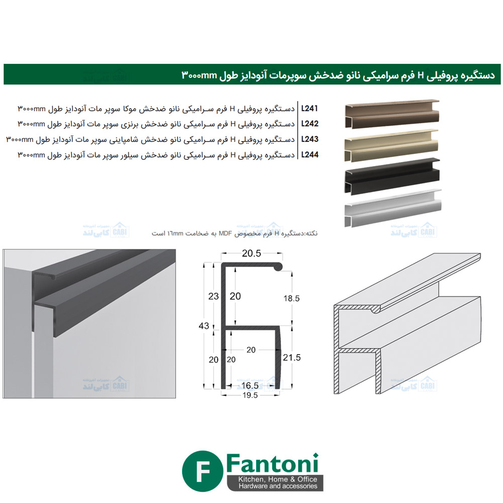 دستگیره پروفیلی H فرم سرامیکی نانو ضدخش سوپر مات آنودایز طول 3000mm فانتونی L241 تا L244 :