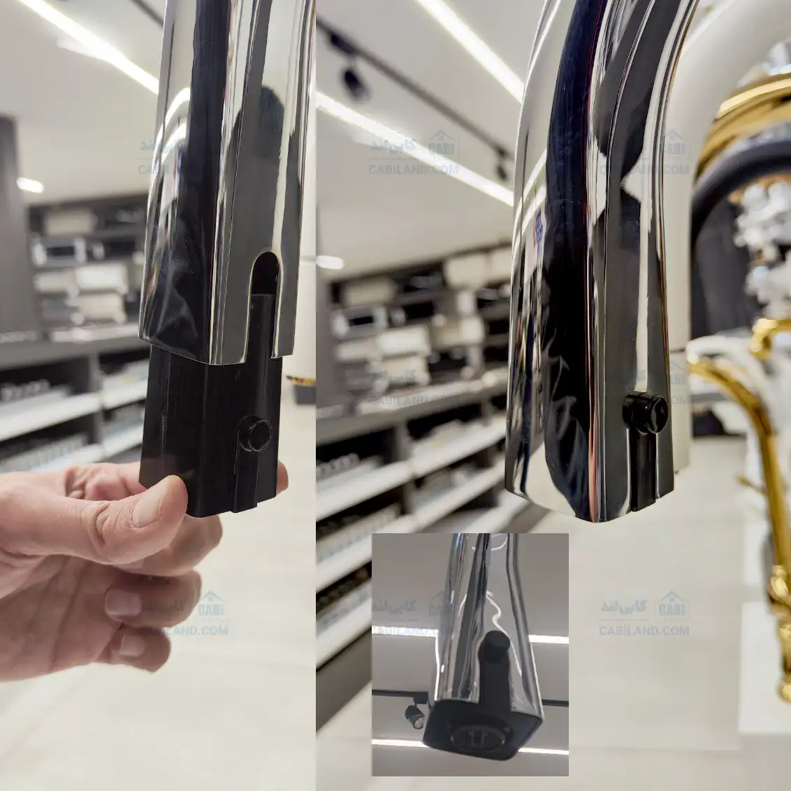 مطابق تصویر فوق در قسمت پشت شیر یک هندل مشکی رنگ قرار دارد که با کشیدن آن به سمت پایین می توان از شلنگ شاوری شیر آیدر شودر استفاده نمود.