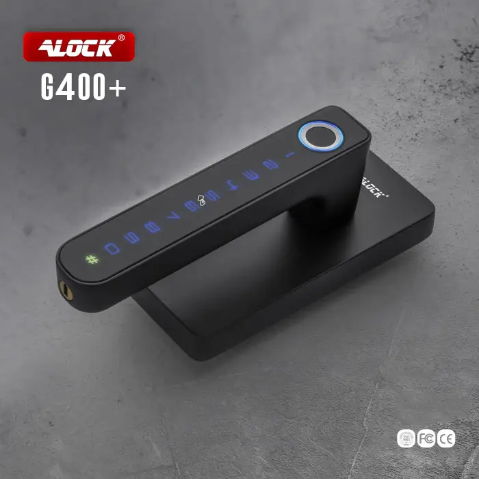 قفل هوشمند مخصوص شیشه سکوریت ALOCK مدل +G400 برای درب های شیشه سکوریت لولایی با فریم الومینیومی یا پارتیشنی و یا ترمال بریک قابل استفاده می باشد.