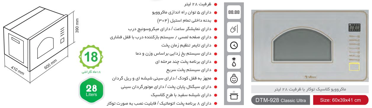 مایکروویو توکار DTM -928 classic یک ماکرویو با امکانات و ویژگی های خاص است. به عنوان مثال این محصول دارای منوی اتومات، سیستم یخ زدایی، دارای تایمر تنظیم زمان پخت، سیستم پخت سریع و قفل کودک و … است. طراحی این محصول در دو رنگ مشکی و سفید با طرح کلاسیک می باشد.