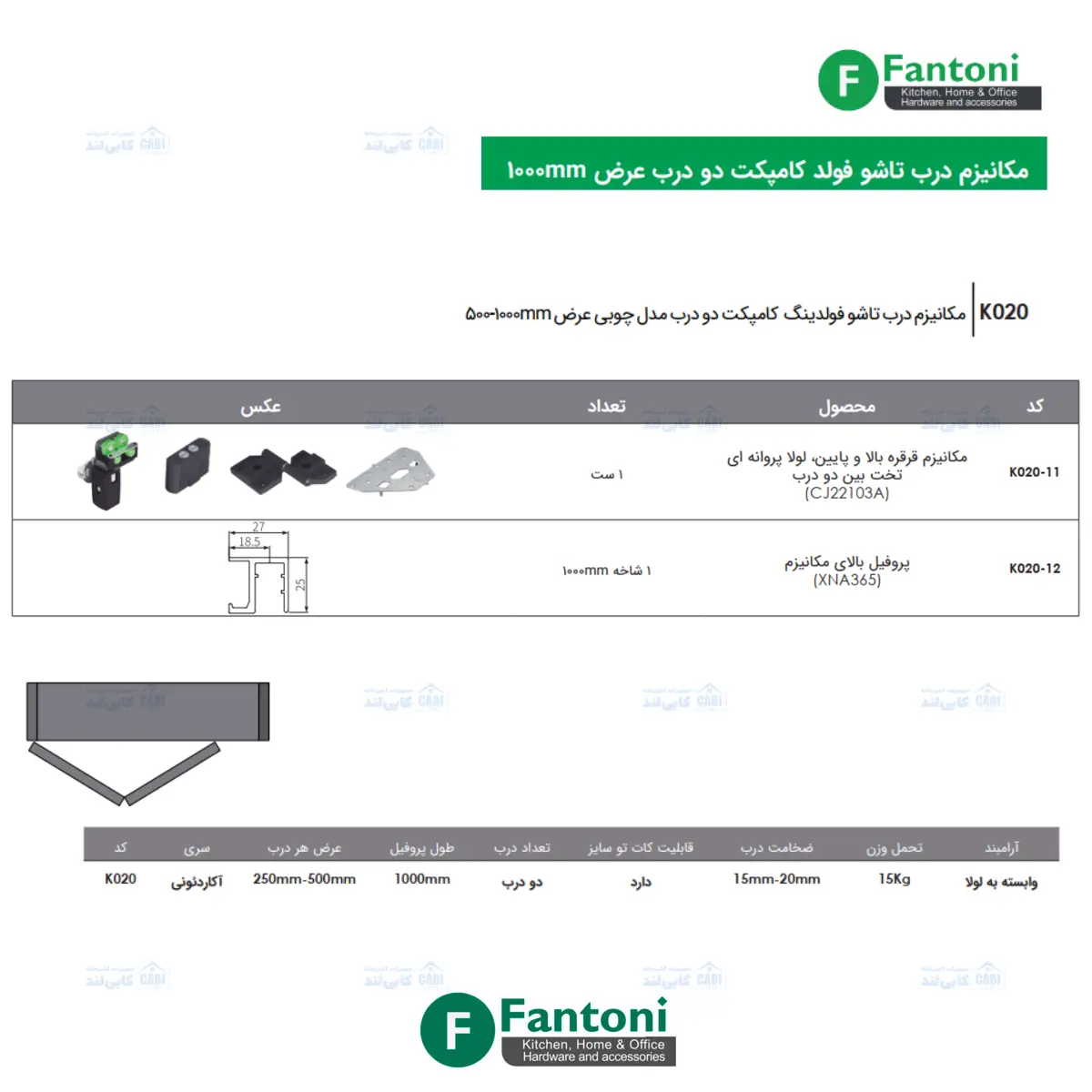 مکانیزم درب تاشو فولدینگ کامپکت دو درب چوبی عرض 500-1000mm فانتونی K020 شامل ست قرقره و لولا پروانه و شاخه 1 متری پروفیل بالا با 5 سال گارانتی بی قید و شرط فانتونی