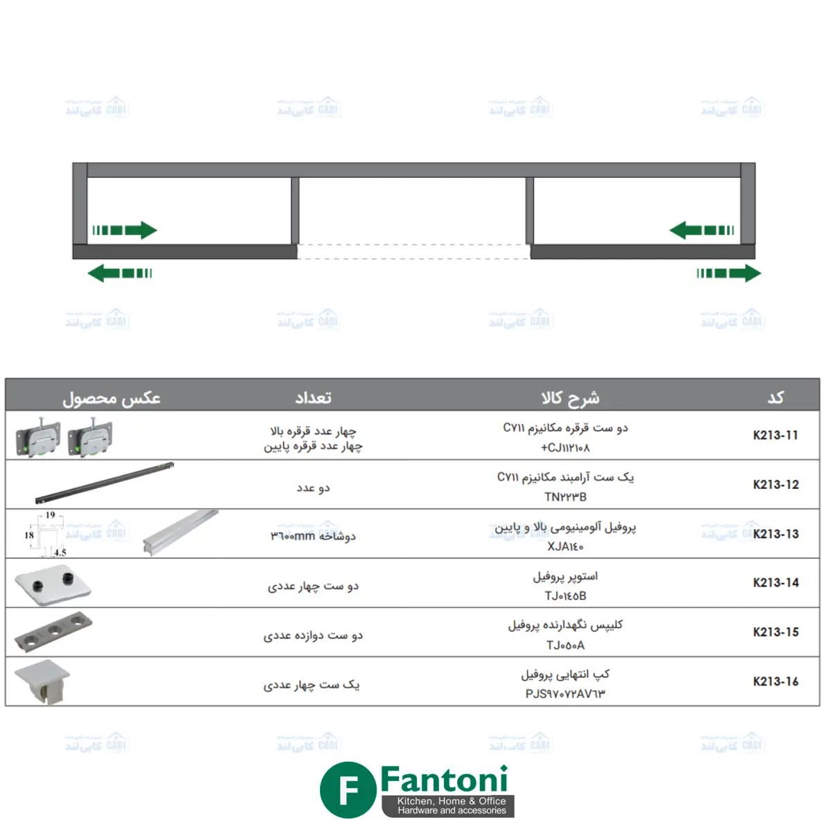 مکانیزم درب ریلی SL خطی کتابخانه جامع روکار با آرامبند فانتونی K213 تحمل وزن 30kg و طول پروفیل 3600mm با قابلیت برش با ۵ سال گارانتی بی قید و شرط فانتونی