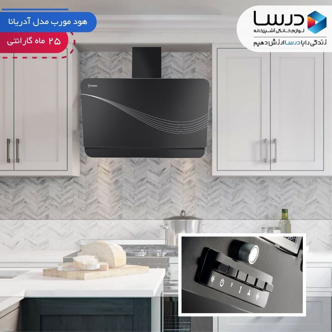 هود مورب درسا مدل آدریانا محصولی اقتصادی با طراحی زیبا و کارایی بالا است . این هود دارای موتور 4 دور است . جهت تنظیم سرعت دور موتور می توانید از کلیدهای فشاری روی محصول استفاده نمایید. این محصول دارای 1عدد لامپ SMD جهت روشن کردن سطح اجاق گاز در هنگام طبخ غذا می باشد. فیلتر این محصول از نوع آلومینیومی با قابلیت شستشو است.جهت باز کردن درب هود جک گازی روی درب محصول تعبیه شده است.